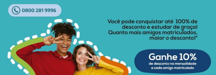 Indique um aluno e a cada matrícula efetivada você ganhará 10% de desconto em sua mensalidade , podendo chegar até 100% de desconto.